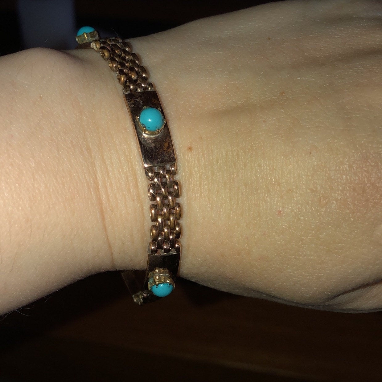 A beautiful original bracelet, in a rose gold filled, a beautiful link with panels inbetween each panel being 18mm in length and set with a turquoise of 5mm round, being 4 of these, the bracelet has a snap lock and is 7 inches when closed